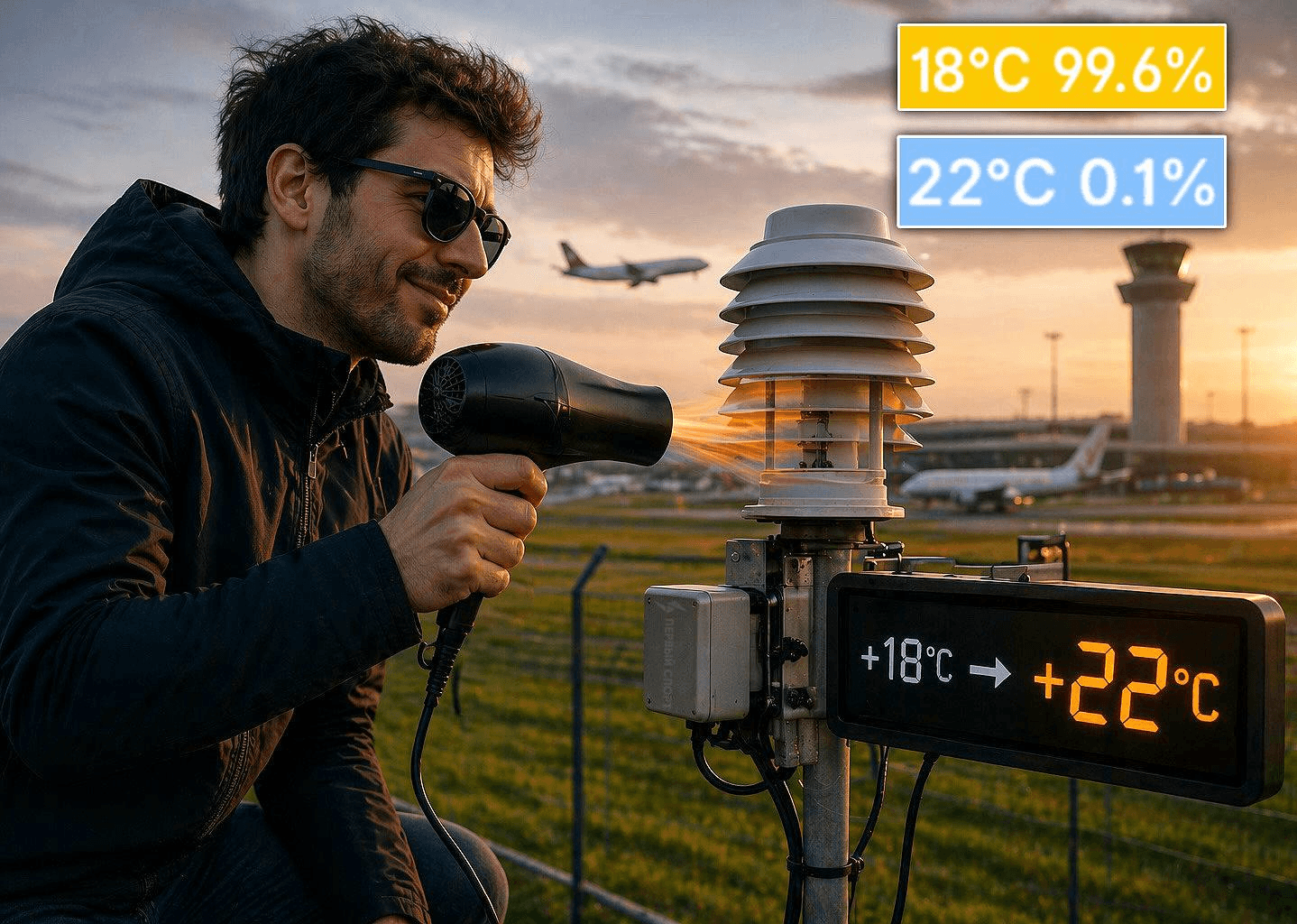 Мужчина понял, что букмекер рассчитывает исход ставки на максимальную дневную температуру воздуха в Париже по единственному датчику рядом с аэропортом, который стоит там без какой-либо охраны. Француз сделал ставку с огромным кэфом на то, что 15 апреля в Париже будет +22°C: это было почти невозможно, потому что по прогнозу ожидалось лишь +18°C. После этого мужчина приехал в аэропорт Шарля-де-Голля и просто нагрел датчик феном: температура воздуха «в Париже» временно поднялась до +22°C, а парень выиграл 34 000 долларов. Теперь букмекер перешёл на показания защищённого датчика погоды в другом аэропорту