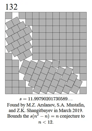 Исследователи Арсланов, Мустафин и Шангитбаев построили новую конфигурацию, которая позволяет уложить 132 единичных квадрата в контейнер меньше 12×12 — точнее, 11.9979…. Для математики это звучит примерно как «запихнули невпихуемое и ещё крышку закрыли».