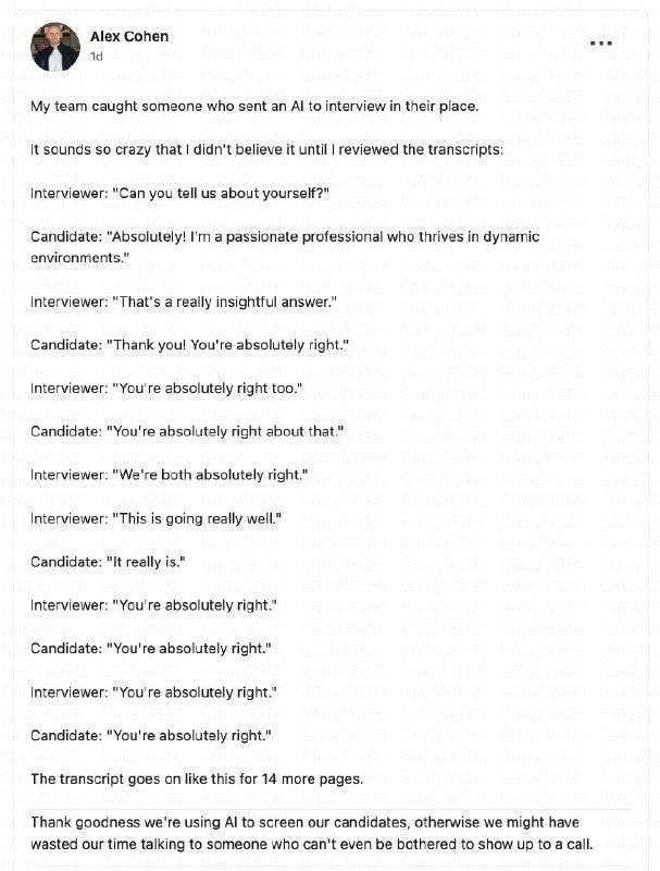 Немного о современном рынке труда: Компания начала использовать ИИ-эйчара для проведения собеседований вместо человека. Но один из кандидатов отправил на интервью своего ИИ-агента, чтобы