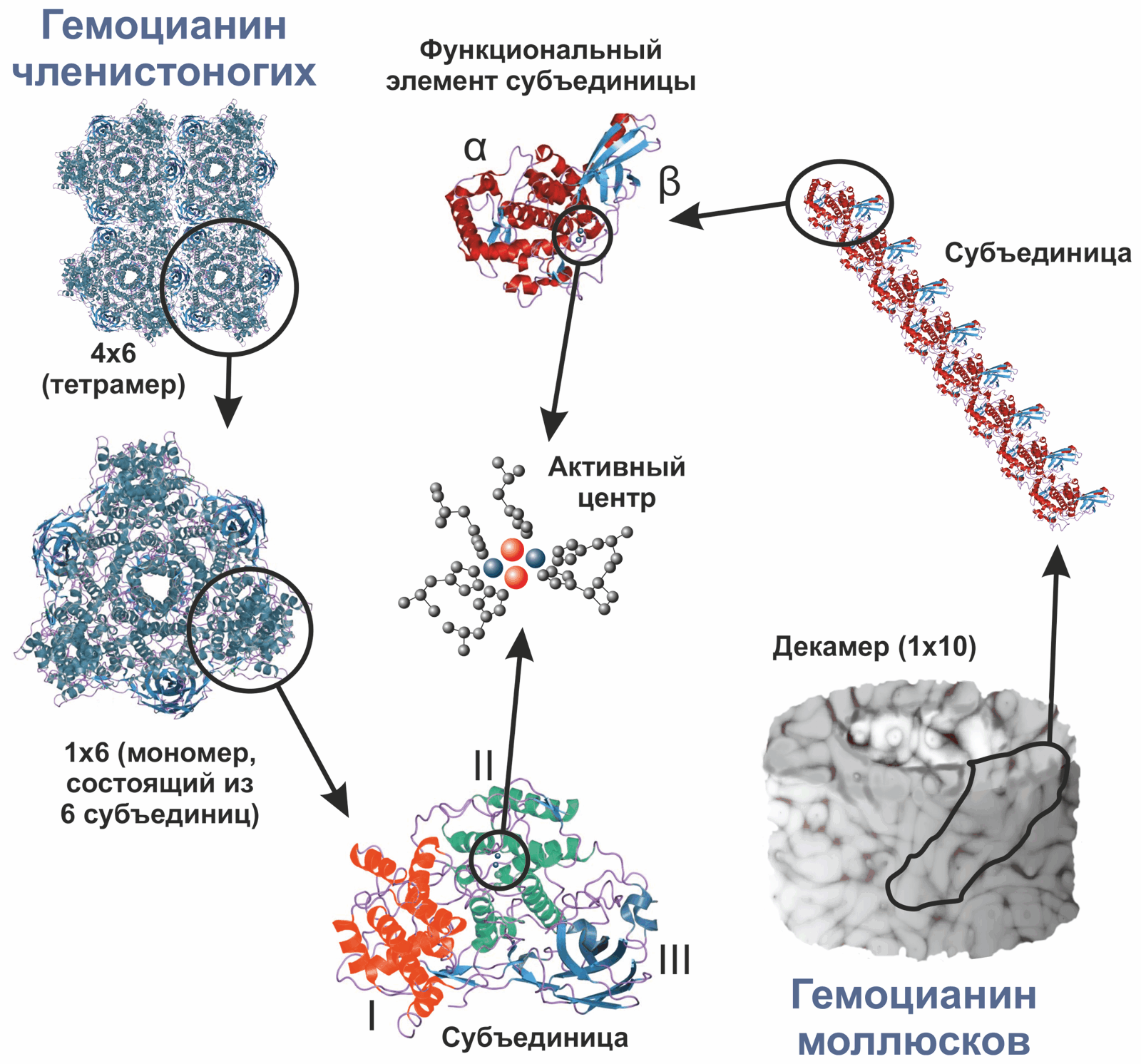На этой картинке, взятой из википедии, молекула гемоцианина членистоногих. Гемоцианин это переносчик кислорода в крови, важно что кровь основанная на гемоцианине имеет синий цвет.