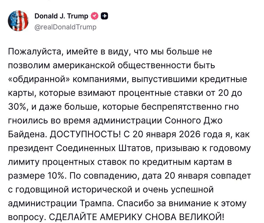 Новогодняя ШмараПолитикапозавчераПрезидент от народаТрамп объявил о введении максимальной процентной ставки в 10% по кредитным картам с 20 января 2026 года. Президент США заявил, что «не позволит грабить американцев» ставками в 20–30%.