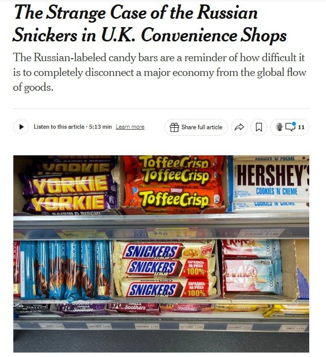 Среди привычных британцам батончиков на полках появились редкие для Европы варианты — Snickers в белом шоколаде и со вкусом «пломбир». Представители компании-производителя Mars объяснили, что не могут помешать посредникам закупать продукцию в России и перепродавать её в других странах, включая Великобританию. Несмотря на санкции и уход многих западных брендов, российские товары находят лазейки для попадания на международный рынок