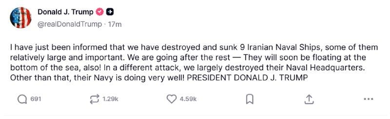 США потопили 9 иранских военно-морских кораблей, а также разрушили штаб-квартиру ВМС Ирана, написал Трамп в Truth Social.