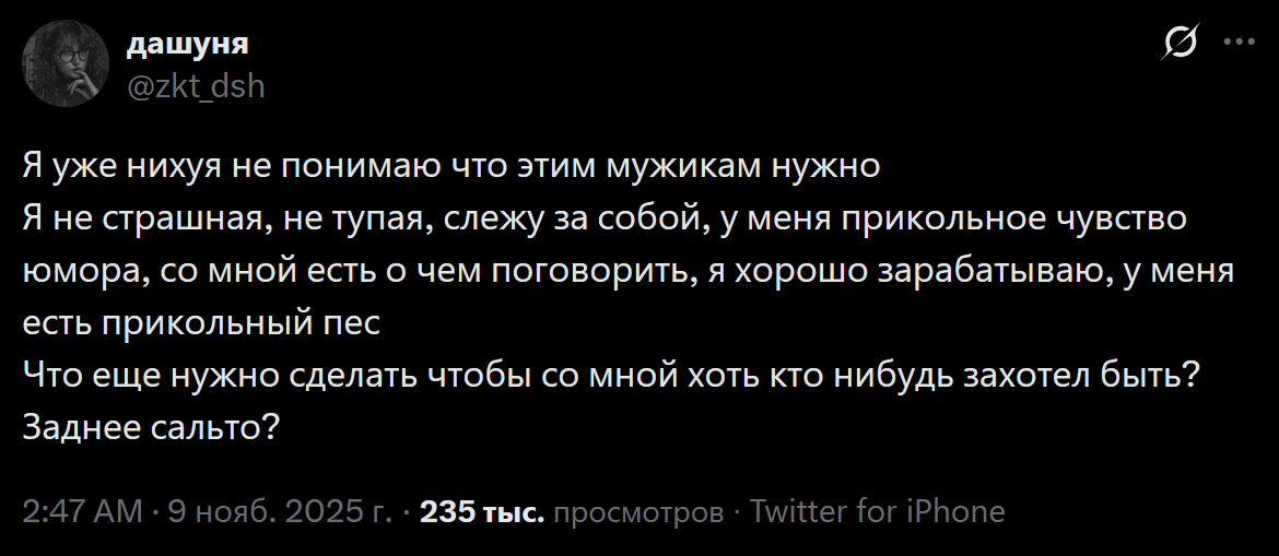 но это ладно, я не понимаю что она хочет вообще. задала вопрос в публичное пространство - получила ответ - порвалась. претензию про тянок, что не дадут скуфам вообще не понял. типа это вроде как у неё проблемы с сексом, раз "хоть кто-нибудь со мной захотел быть".